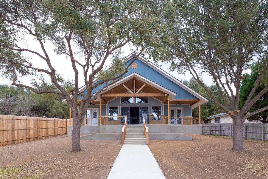 This modern farm/lake house is the perfect mix for the Texas Hill Country. With a large stone exterior in the front, and a modern patio with a lake view in the back, this house has everything our client could have asked for. The stone accent wall in the kitchen combined with our wooden braces and beams also make the perfect complement for this living area.