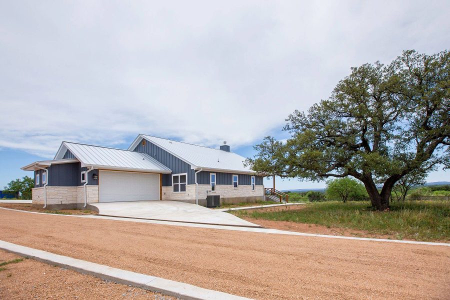 This modern ranch home with 3,117 square feet is perfect for anyone looking to escape the city. This home has a white stone exterior with blue siding and metal roof. In the living room and kitchen, our warm wooden ceiling instantly attracts your eyes. Our timber ridge beams and wooden accents throughout the home really gives this home a modern ranch home feel. There is no better way to relax than by starting or ending the day sitting out on this covered porch and observing nature and the amazing views. We are proud to showcase this home as one of our custom ranch developments.